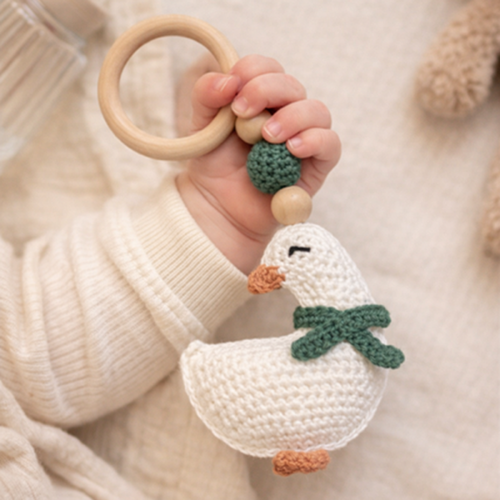 Met dit haakpatroon maak je een superleuke gans bijtring. Het is een platpatroon, met de sjaal en kraal kun je eindeloss varieren qua kleuren.