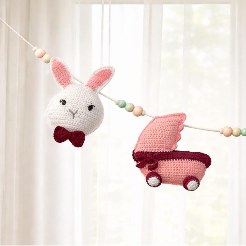 Je kunt de wiegjes en konijntje meerdere keren herhalen voor een leuke slinger. Ook kun je qua kleuren zoveel variaties maken.