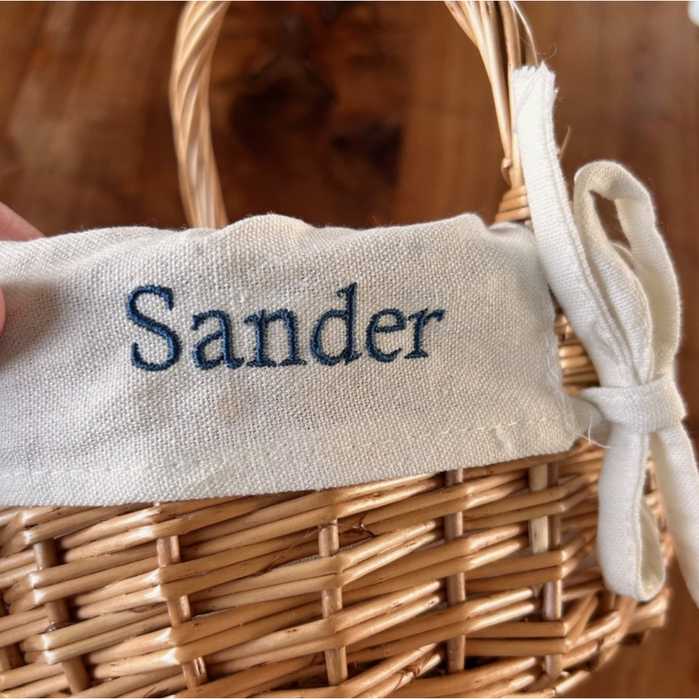 De naam wordt op het mandje geborduurd. De kleuren kunnen worden aangegeven bij het plaatsen van de bestelling.